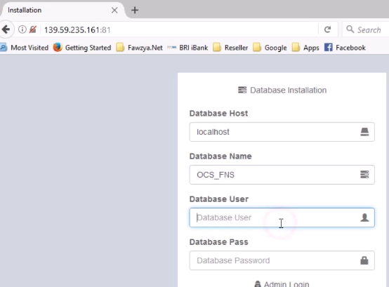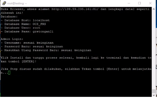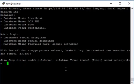 Tekan Sembarang tombol dan installasi akan berjalan - Ditengah installasi akan ada Pemberitahuan untuk menginstall Database OCS Panel melalui Browser