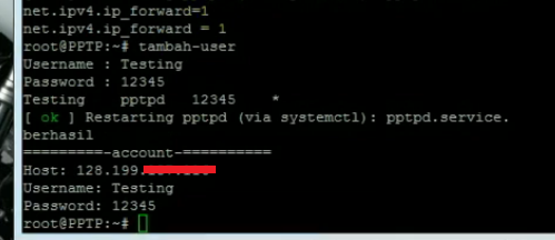 Untuk menambahkan Username dan password akun baru silahkan ketik “tambah-user”, anda akan diminta memasukan nama user dan kata sandi akun barunya. Setelah itu anda akan menerima detail login akun yang telah berhasil dibuat