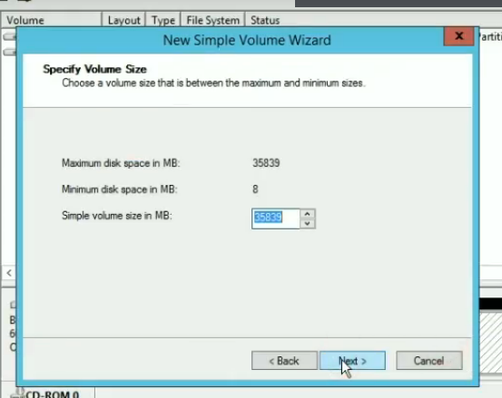 - Klik next, simple volume size menandakan kapasitas yang akan di tambahkan pada hardisk.