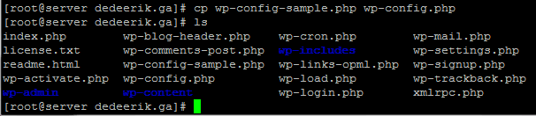 Gunakan command ls untuk cek apakah anda sudah berhasil membuat file wp-config.php atau belum :