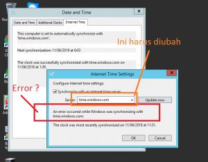 - Masuk ke settingan internet time, klik Update Now. Jika muncul Notifikasi error seperti dibawah ini