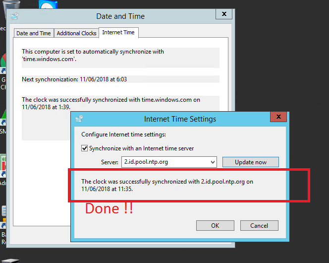 - Setelah mengubah time server Wajib di cek dulu time servernya normal atau tidak (karena tidak semua nya work). caranya di klik update now, jika Time server aktif maka akan muncul notif success seperti berikut