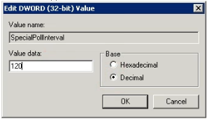- Pada Special Pool Interval, Base Pilih Desimal, isi value dengan angka (detik). Misalnya anda menginginkan waktu singkron setelah 2 menit, maka isi value dengan 120. ini berarti waktu akan disingkron ke internet setiap 2 menit sekali